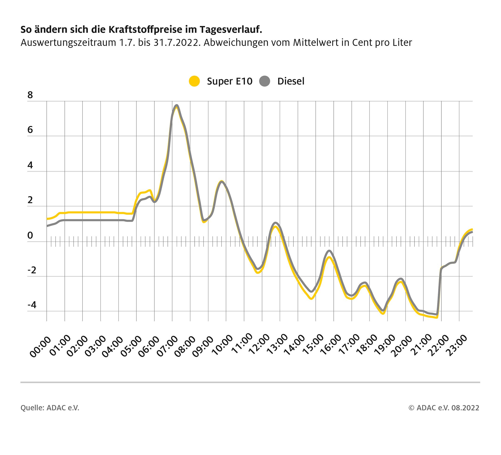 Über den ganzen Tag verteilt hat der ADAC sieben regelmäßige Preisspitzen ermittelt. Teuerster Zeitpunkt zum Tanken ist morgens kurz nach 7 Uhr. Zwischen 5 und 11 Uhr schwanken die Preise recht stark und liegen fast immer über dem Niveau des restlichen Tages. Ab Mittag sinken die Durchschnittspreise für Benzin und Diesel in regelmäßigen Wellenbewegungen tendenziell bis gegen 22 Uhr. Die niedrigsten Tagespreise an den Tankstellen werden zwischen 20 und 22 Uhr erreicht. Aber auch der Zeitraum zwischen 18 und 19 Uhr ist bereits relativ günstig. Während der Nachtstunden gibt es kaum Preisänderungen. Insgesamt sind die Wellenbewegungen der Preise beider Kraftstoffsorten wieder nahezu parallel.