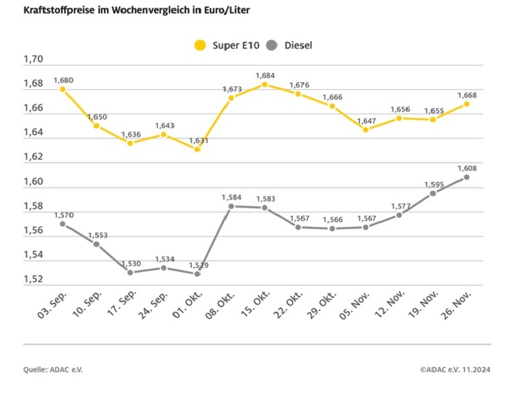 Die Preise für Benzin und Diesel sind im Vergleich zur vergangenen Woche gestiegen. Wie die aktuelle ADAC Auswertung der Kraftstoffpreise in Deutschland zeigt, kostet ein Liter Super E10 im bundesweiten Mittel 1,668 Euro, das sind 1,3 Cent mehr als in der Vorwoche.