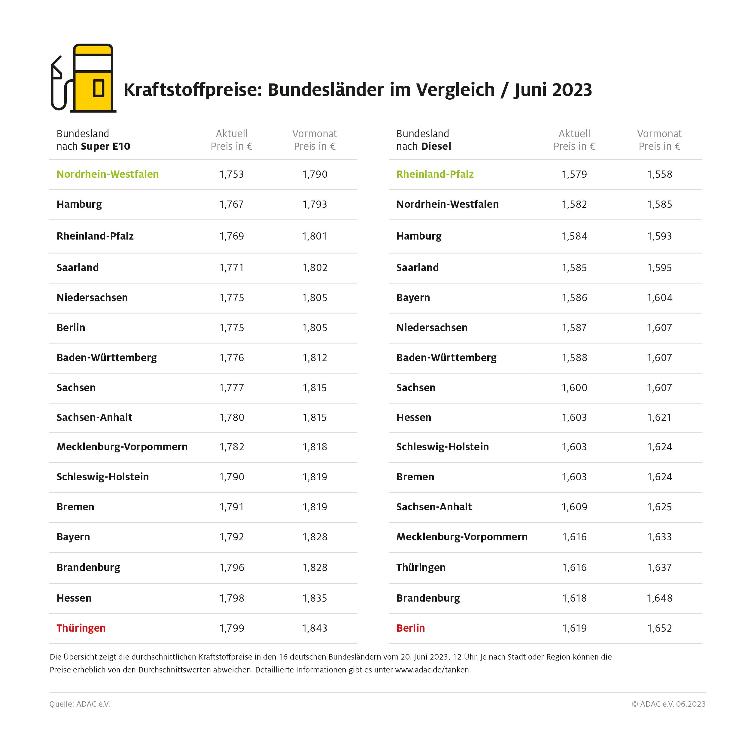 München (ots) – Die regionalen Preisunterschiede zwischen den Kraftstoffpreisen innerhalb Deutschlands haben sich erneut verringert. Wie die aktuelle ADAC Auswertung der Kraftstoffpreise in den 16 deutschen Bundesländern zeigt, kostet ein Liter Super E10 im bevölkerungsreichsten Bundesland Nordrhein-Westfalen mit durchschnittlich 1,753 Euro bundesweit am wenigsten. Am teuersten ist Super E10 derzeit in Thüringen mit 1,799 Euro.