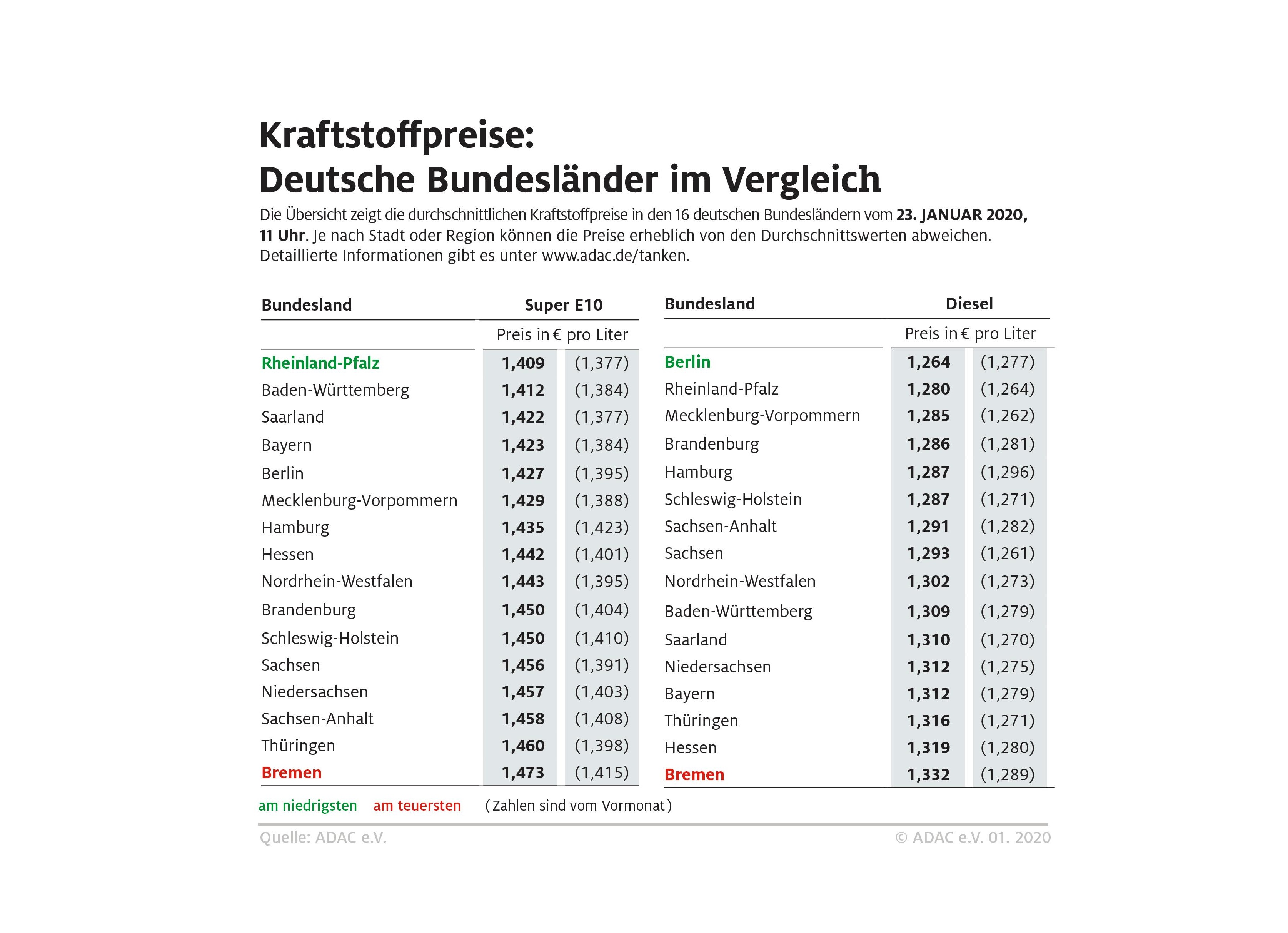 In der aktuellen Untersuchung hat der ADAC am heutigen Donnerstag um 11 Uhr die Preisdaten von mehr als 14.000 bei der Markttransparenzstelle erfassten Tankstellen ausgewertet und den Bundesländern zugeordnet. Die ermittelten Preise stellen eine Momentaufnahme dar. Unkomplizierte und schnelle Hilfe für preisbewusste Autofahrer bietet die Smartphone-App „ADAC Spritpreise“. Ausführliche Informationen rund um den Kraftstoffmarkt gibt es zudem unter www.adac.de/tanken.