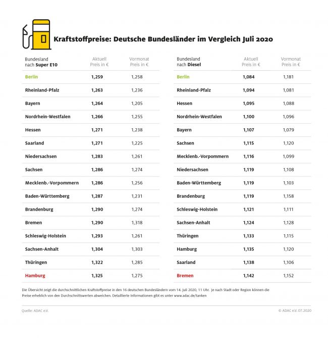 München (ots) – Auch in Corona-Zeiten zeigen die Kraftstoffpreise in Deutschland starke regionale Abweichungen. Super E10 ist derzeit in Berlin am günstigsten. Laut aktuellem Bundesländervergleich des ADAC kostet ein Liter dort durchschnittlich 1,259 Euro. Auf den Plätzen zwei und drei folgen Rheinland-Pfalz (1,263 Euro/Liter) und Bayern (1,264 Euro/Liter). Schlusslicht ist der Stadtstaat Hamburg, wo man für einen…