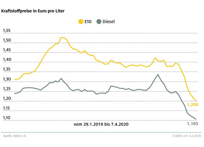 München (ots) Die weltweite Corona-Krise lässt die Kraftstoffpreise an den Tankstellen weiter fallen. Laut aktueller Auswertung des ADAC müssen Autofahrer für einen Liter Super E10 im Bundesmittel 1,200 Euro bezahlen, das sind 1,7 Cent weniger als in der Vorwoche. Diesel verbilligte sich um 1,0 Cent auf durchschnittlich 1,105 Euro je Liter. Seit Jahresbeginn haben die Spritpreise…