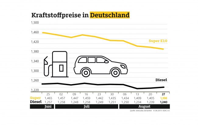 München (ots) Autofahrer in Deutschland können den dritten Monat in Folge billiger tanken. Laut der monatlichen Marktauswertung des ADAC kostete ein Liter Super E10 im August im Bundesdurchschnitt 1,412 Euro und damit 3,6 Cent weniger als im Juli. Diesel verbilligte sich gegenüber dem Vormonat um 1,1 Cent auf durchschnittlich 1,241 Euro je Liter.   Tanken ist…