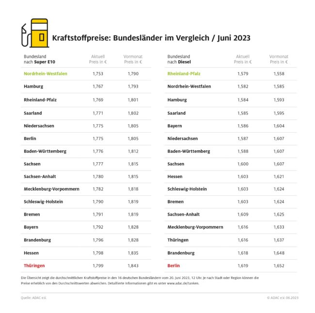 ADAC: Dieselpreis im ersten Halbjahr 2023 normalisiert – Diesel gegenüber Vorjahreszeitraum 22,1 Cent günstiger – Benzin 13 Cent billiger – Nur geringe Preisschwankungen im abgelaufenen Monat