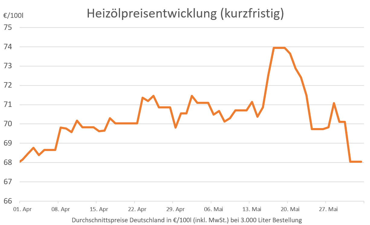 Dies schlägt sich natürlich auch bei den Preisen für Heizöl nieder, das nun ebenfalls deutlich günstiger zu haben ist. Am Freitag lag der Durchschnittspreis für Heizöl in Deutschland bei ca. 68,04 Euro pro 100 Liter. Dies sind satte 5,90 Euro pro 100 Liter oder knapp 8% günstiger als im Jahreshoch. Die kurzfristige sowie langfristige Trendbox zeigen zudem, dass Heizöl sowohl im Wochen-, Monats- und auch Jahresvergleich relativ günstig ist, und sich hieraus eine gute Kaufmöglichkeit ergibt.