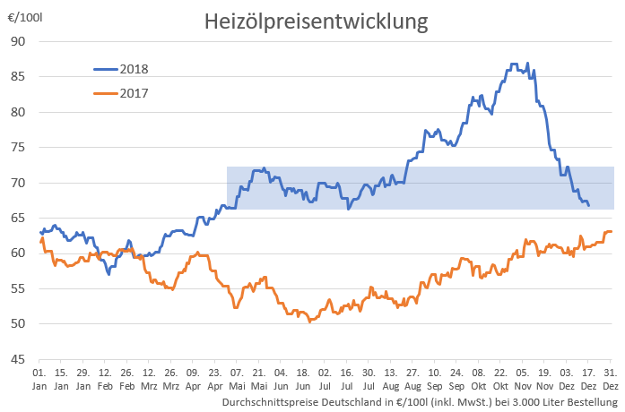 Wer mit seiner Heizölbestellung gewartet hat, hat bisher alles richtig gemacht! Bereits letzte Woche waren die Niveaus so niedrig wie seit 5 Monaten nicht mehr, doch in der letzten Woche vor Weihnachten ergeben sich noch einmal neue Schnäppchen-Chancen. Im Vergleich zum Freitag ist der Heizölpreis im Deutschland Durchschnitt noch einmal um -0,8% gefallen, sodass der 100 Liter erstmals seit dem 18. Juli für unter 67 Euro zu haben sind. Dies bezieht sich auf eine Bestellung von 3.000 Liter, inklusive Steuer im deutschen Mittelwert.