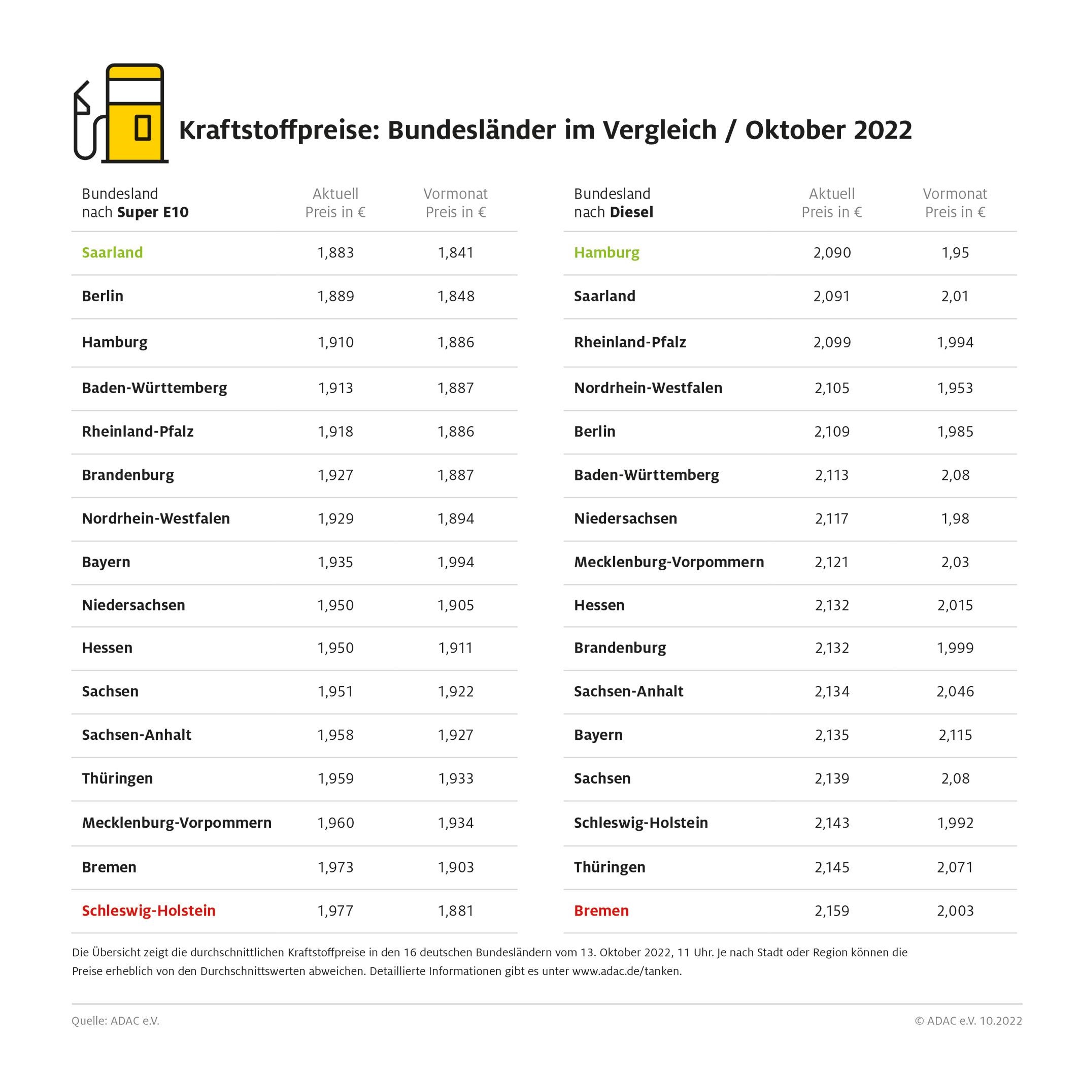 München (ots) – Der letzte Preissprung setzt ganz Deutschland zu, doch aktuell müssen Autofahrerinnen und Autofahrer in großen Teilen von Norddeutschland beim Tanken am tiefsten in die Tasche greifen. So werden laut heutiger ADAC Auswertung der Kraftstoffpreise in den 16 Bundeländern in Bremen 2,159 Euro für einen Liter Diesel fällig. Super E10 ist in Schleswig-Holstein mit 1,977 Euro pro Liter am teuersten. Insgesamt ist das Tanken im Saarland derzeit am günstigsten: E10 gibt es hier für 1,883 Euro je Liter, Diesel kostet im Schnitt 2,091. Hier ist nur Hamburg mit 2,090 Euro einen Hauch billiger.