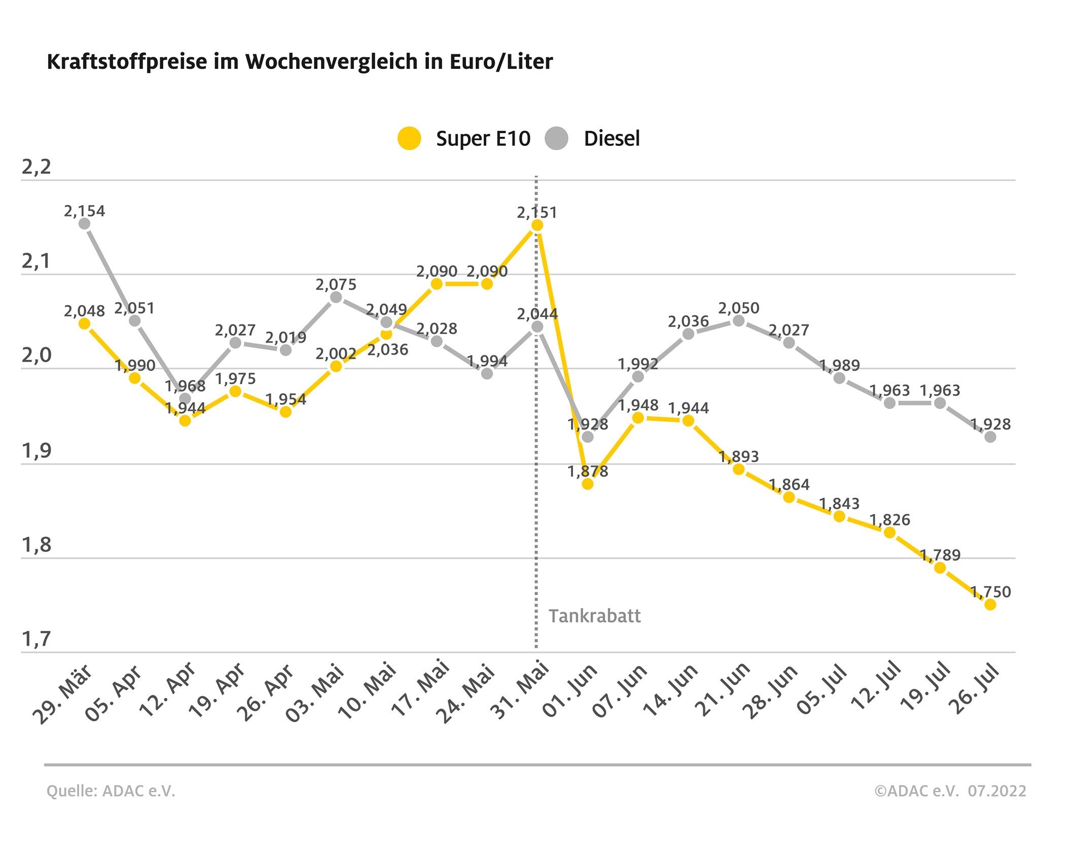 München (ots) – Die Kraftstoffpreise in Deutschland sind deutlich niedriger als in der Vorwoche. Wie die aktuelle ADAC Auswertung der Tankstellenpreise zeigt, kostet ein Liter Super E10 im bundesweiten Mittel derzeit 1,750 Euro und damit 3,9 Cent weniger als vor einer Woche. Auch der Preis für Diesel-Kraftstoff ist gesunken: Ein Liter kostet im Schnitt 1,928 Euro, das ist ein Minus von 3,5 Cent gegenüber der Vorwoche.