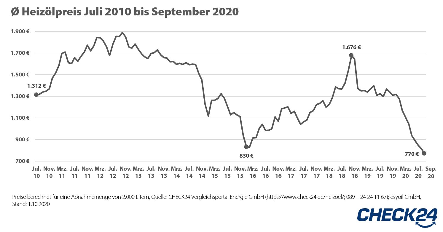 – 2.000 Liter Heizöl kosteten im September im Schnitt 770 Euro – niedrigster Preis seit zehn Jahren