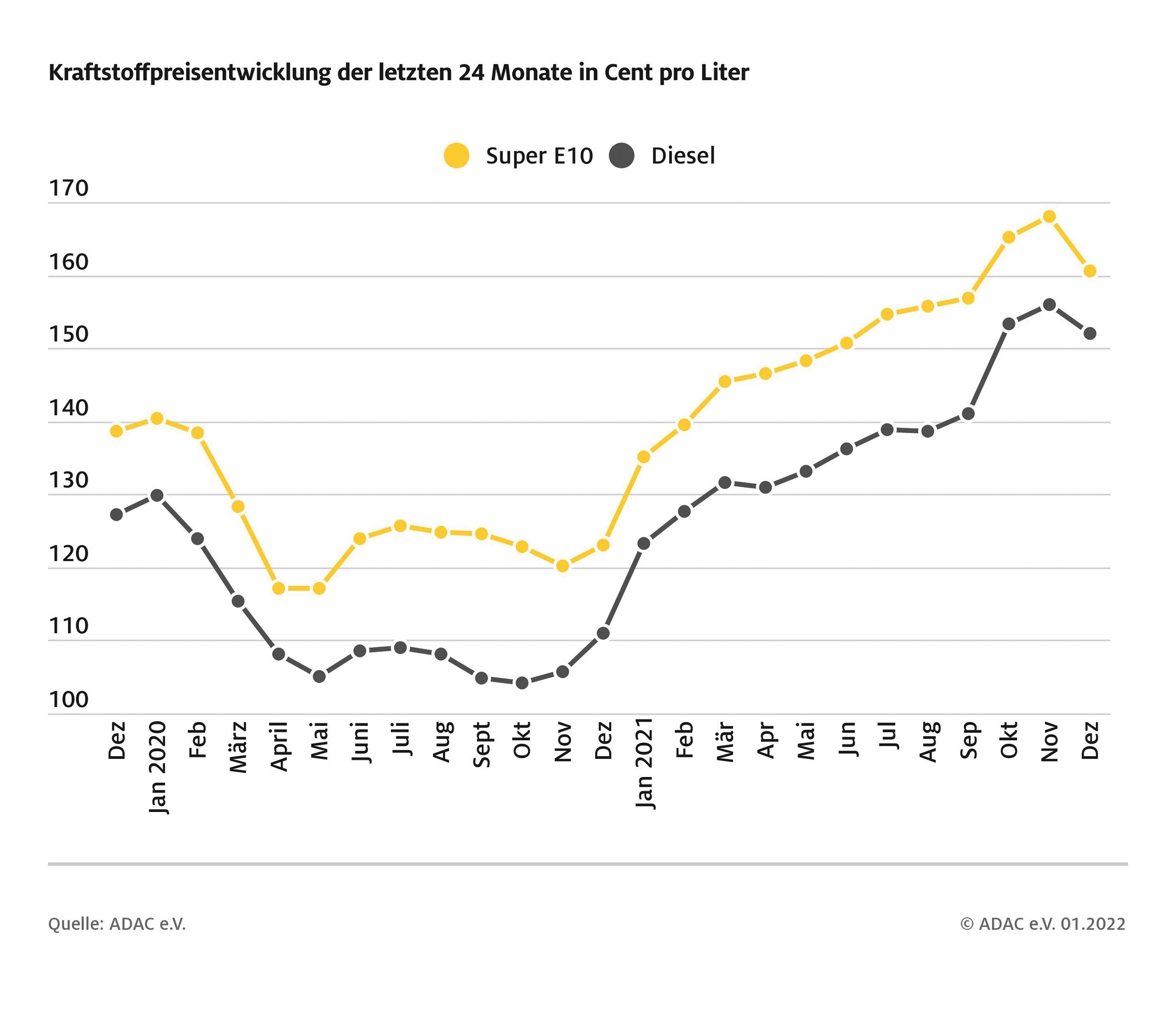 Der starke Spritpreisanstieg bis in den November hinein beruhigte sich im Dezember wieder ein wenig. So war der 22. Dezember der günstigste Tanktag des Monats. Ein Liter Super E10 kostete im bundesweiten Mittel 1,588 Euro, ein Liter Diesel 1,504 Euro. Der letzte Tag des Jahres war gleichzeitig der teuerste Tag beider Kraftstoffe im Dezember mit durchschnittlich 1,642 Euro je Liter Super E10. Diesel kostete dabei 1,553 Euro pro Liter.