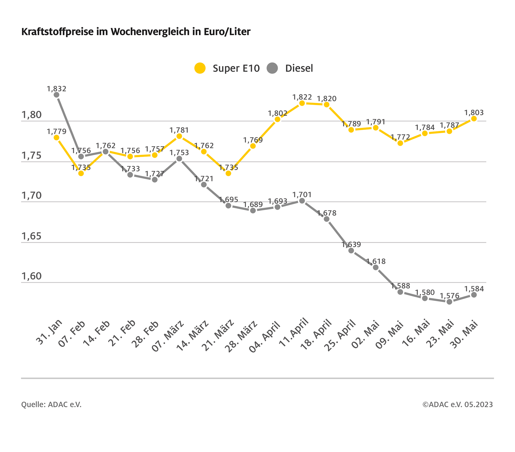 Kraftstoffpreise im Wochenvergleich. Quelle: ADAC e.V.