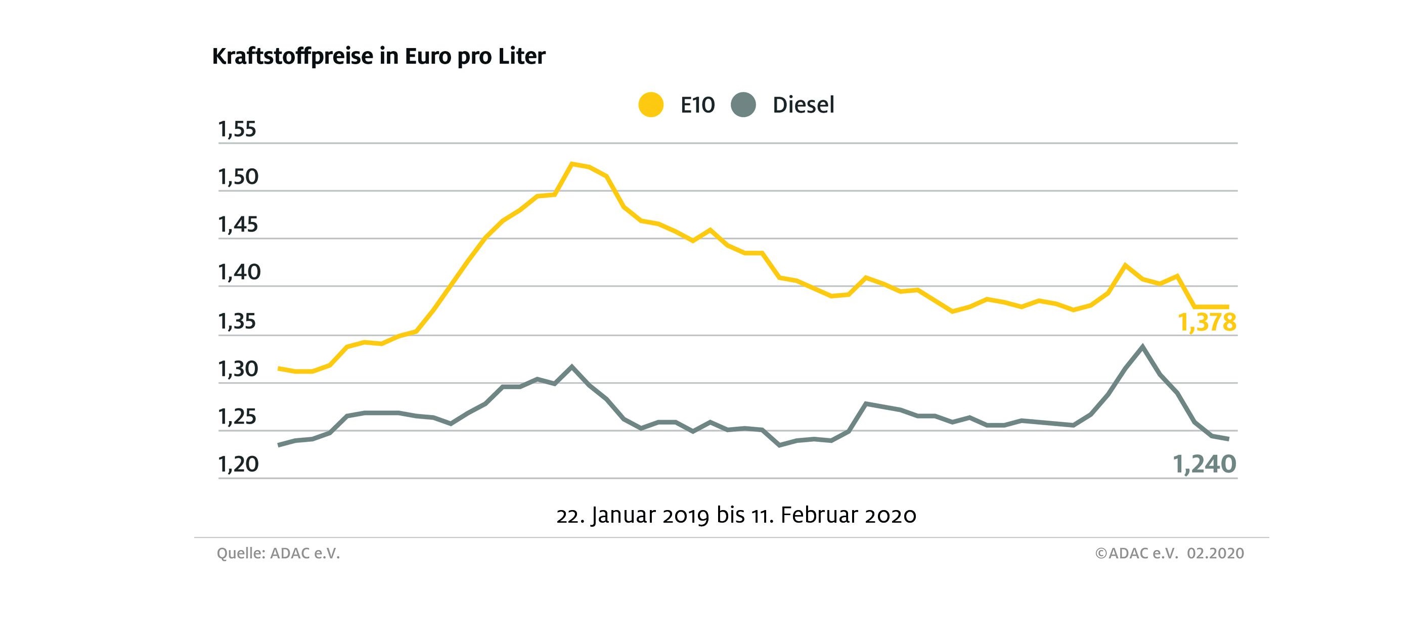 Die Spritpreise an den Tankstellen sind gegenüber der Vorwoche leicht gesunken. Laut aktueller Auswertung des ADAC kostet ein Liter Super E10 im Bundesmittel 1,378 Euro, das sind 0,1 Cent weniger als in der Vorwoche. Diesel verbilligte sich um 0,3 Cent auf durchschnittlich 1,240 Euro je Liter. Dies ist der fünfte wöchentliche Preisrückgang in Folge.