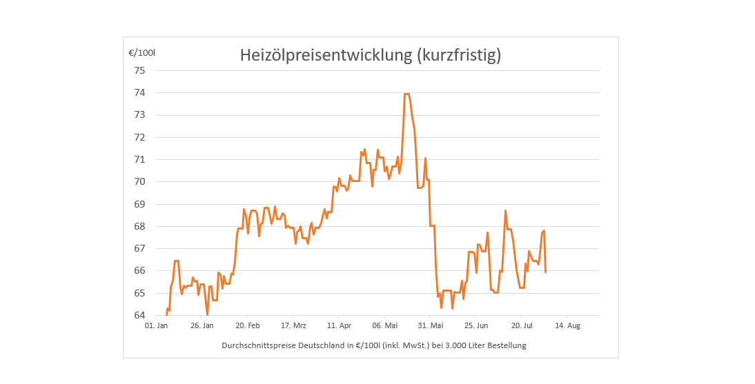 Hinweis: Die genannten Heizölpreise beziehen sich stets auf den deutschlandweiten Durchschnittspreis bei einer Bestellung von 3.000 Liter Heizöl Standard schwefelarm inklusive 19% MwSt.. Durch Transportkosten fallen die Preise regional jedoch unterschiedlich aus. Die Preisspanne zwischen den Regionen kann daher momentan bei bis zu ca. 3,81 Euro pro 100 Liter liegen. Stand der Preise: 02.08.2019