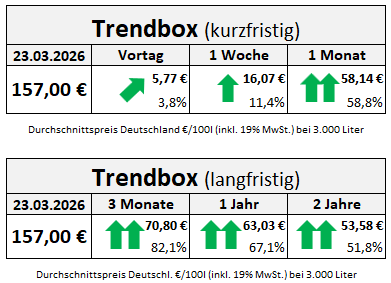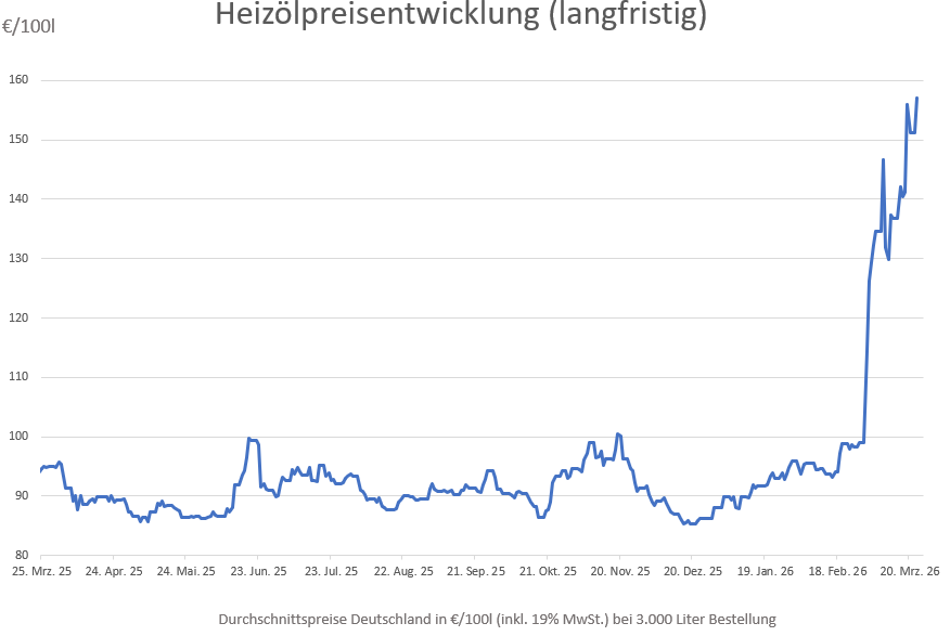Die anhaltenden Unsicherheiten an den Weltmärkten treiben die Ölpreise weiter nach oben und scheinen sobald nicht abzureißen. Politische Spannungen und Versorgungsängste ließen die Preise seit Freitag um +5,77 Euro bzw. +3,8 Prozent ansteigen.  Verglichen mit vor einer Woche stiegen die Kosten beim Kauf von Heizöl in Deutschland um durchschnittlich +16,07 Euro. Im Vergleich zu vor einem Monat, als die USA und der Iran vor Kriegsbeginn ihre Atomverhandlungen intensivierten, werden derzeit Preisanstiege von insgesamt +58,14 Euro bzw. +58,8 Prozent gemeldet.