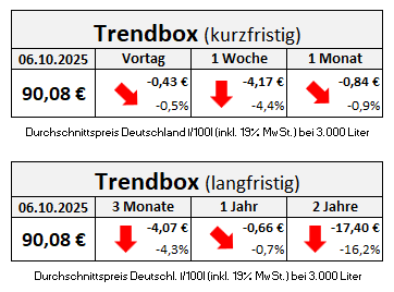 Die genannten Heizölpreise beziehen sich stets auf den deutschlandweiten Durchschnittspreis bei einer Bestellung von 3.000 Liter Heizöl Standard schwefelarm inklusive 19% MwSt. Außerdem fallen durch Transportkosten die Preise regional unterschiedlich aus. Stand der Preise 06.10.2025