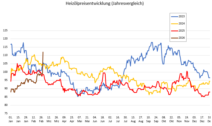 Während die Heizölpreise bis vor kurzem noch einem leichten Aufwärtstrend folgten, kam es am Wochenende im Zug des neu entfachten Iran-Israel-USA-Konflikts zu einer regelrechten Explosion der Ölpreise. Im Lauf des Wochenendes stiegen die Ölpreise aufgrund von Risikoprämien und scharfen Lieferbeschränkungen auch in Deutschland um +12,42 Euro pro 100 Liter Heizöl. Im Vergleich zu vor einer Woche zahlen Abnehmer von Heizöl heute rund +13,45 Euro mehr, im Vergleich zu Anfang Februar knapp +15,42 Euro mehr.