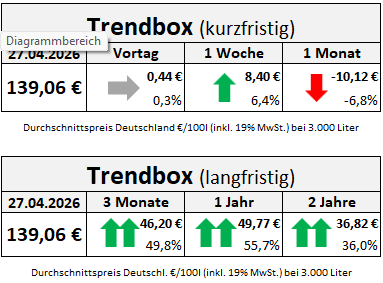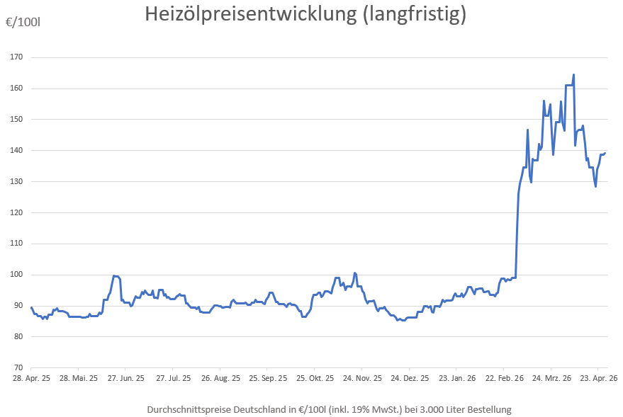 Die genannten Heizölpreise beziehen sich stets auf den deutschlandweiten Durchschnittspreis bei einer Bestellung von 3.000 Liter Heizöl Standard schwefelarm inklusive 19% MwSt. Außerdem fallen durch Transportkosten die Preise regional unterschiedlich aus. Stand der Preise 27.04.2026