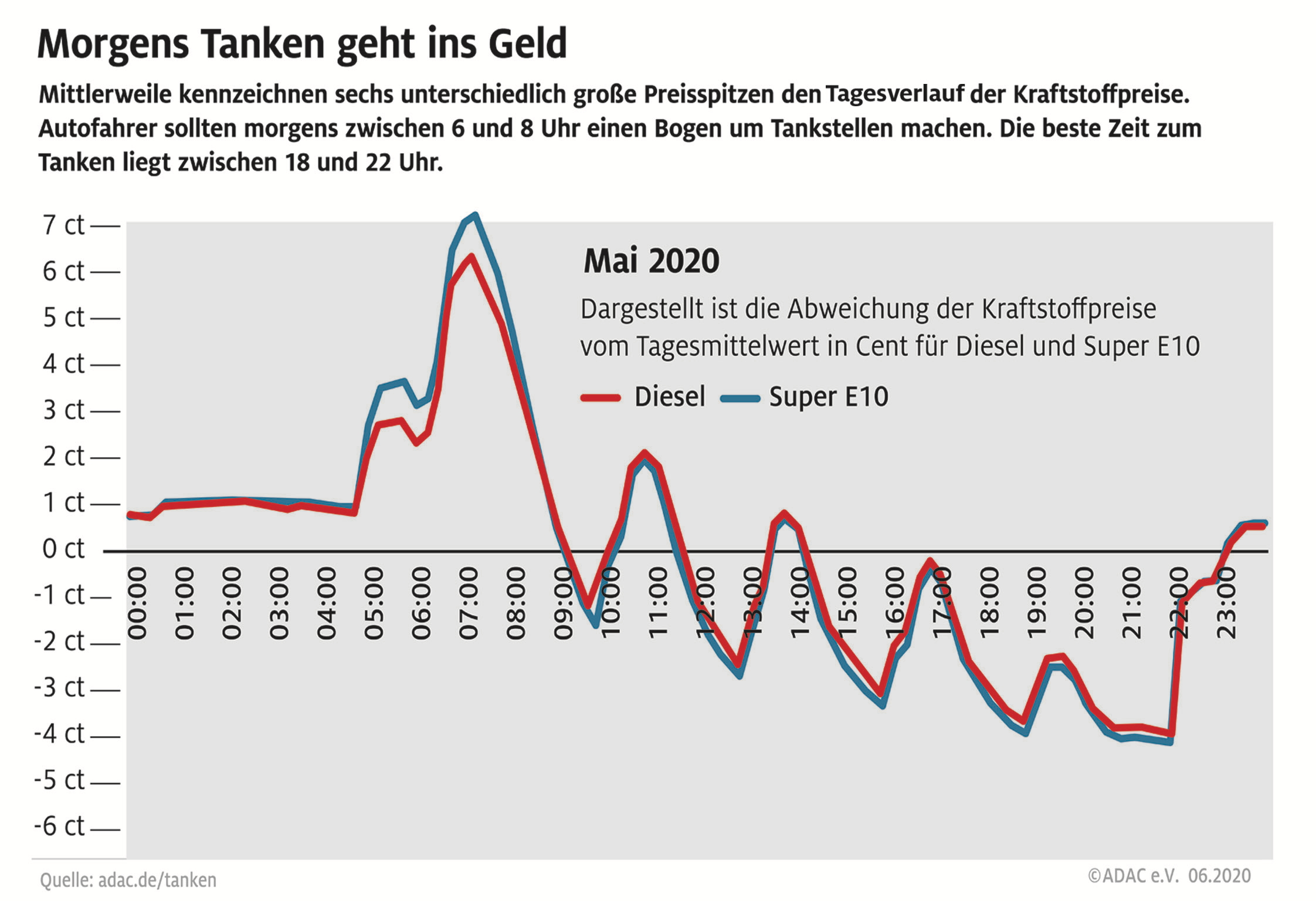 Preisbewusste Autofahrer haben jedoch laut ADAC gute Möglichkeiten, günstig zu tanken. Als Faustregel für die Verbraucher gilt die Empfehlung, im Zeitraum zwischen 18 und 22 Uhr zu tanken. Weitere kürzere Zeitfenster mit relativ günstigen Preisen verteilen sich über den Tag. Vermeiden sollte man tunlichst, morgens zu tanken, denn die höchsten Preise für Benzin und Diesel sind regelmäßig zwischen 5 und 8 Uhr zu bezahlen.