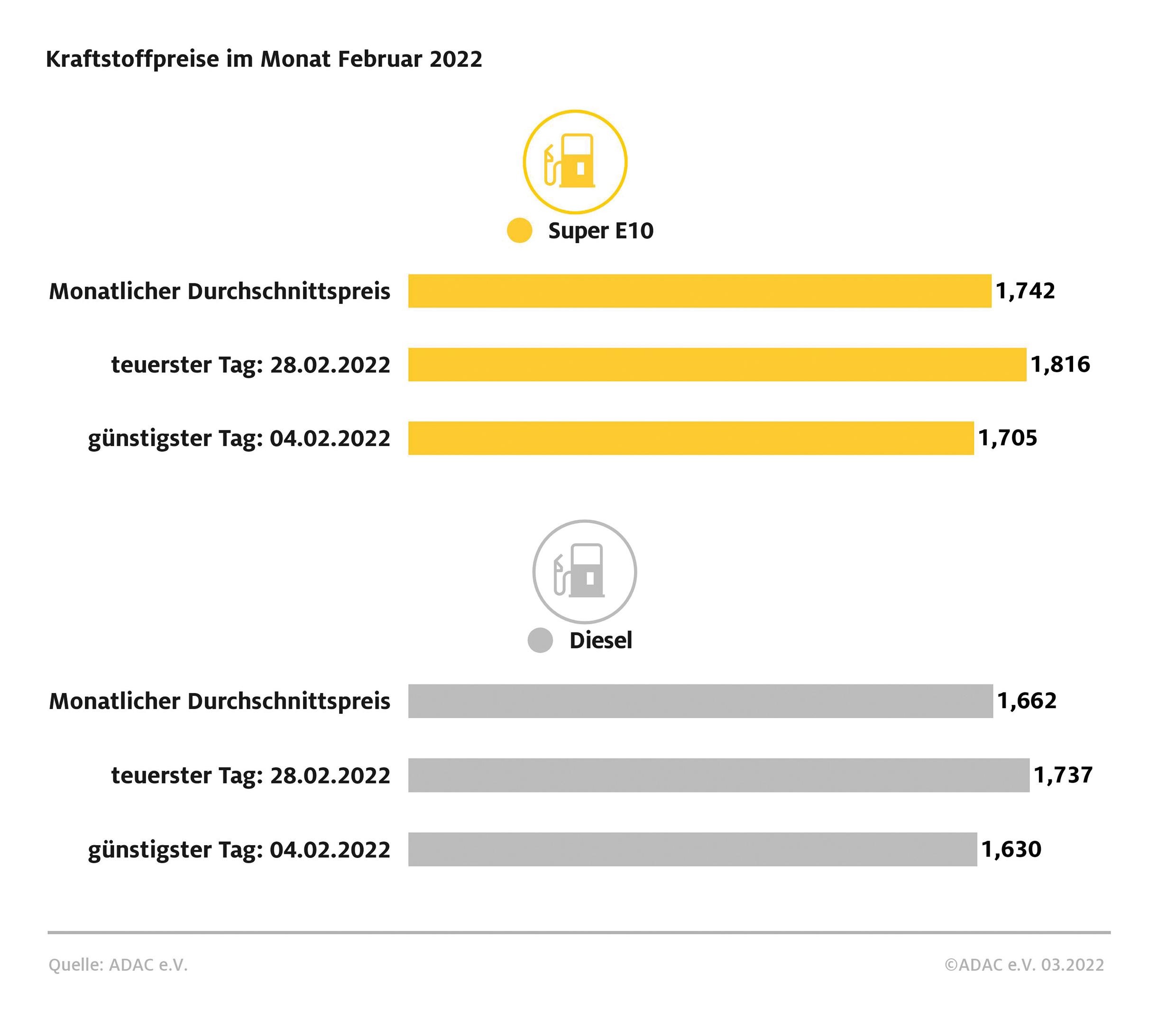 Auch Diesel war am 28. Februar so teuer wie nie. Laut ADAC Auswertung kostete ein Liter im Tagesdurchschnitt 1,737 Euro und damit 10,7 Cent mehr als am 4. Februar, als Diesel mit 1,630 Euro am preiswertesten war.