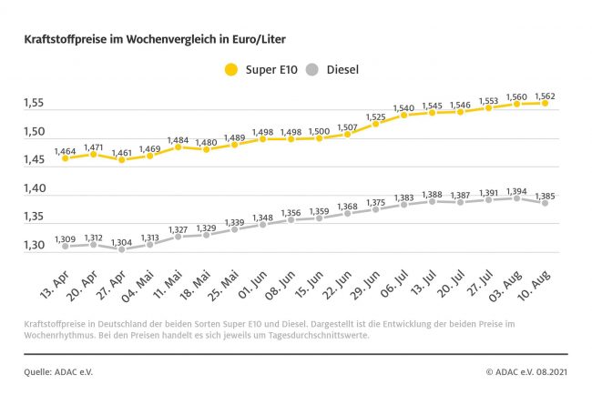München (ots) – 17. August 2021 Die Fahrer von Benziner-Pkw tanken derzeit in Rheinland-Pfalz am günstigsten. Das zeigt die heutige ADAC Auswertung der Kraftstoffpreise in den 16 Bundesländern. Diesel ist momentan in Berlin am preiswertesten. Um vier Cent teurer als in Rheinland-Pfalz ist Benzin laut ADAC in Thüringen, Diesel-Fahrer tanken in Schleswig-Holstein am teuersten. …