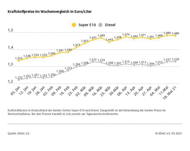 München (ots) – Die Autofahrer mussten im Mai 2021 beim Tanken erneut mehr bezahlen als im Monat zuvor. Für einen Liter Super E10 verlangten die Tankstellen in Deutschland im Schnitt 1,483 Euro und damit 1,7 Cent mehr als im April. Das zeigt die monatliche ADAC Auswertung der Kraftstoffpreise. Auch der Preis für Diesel kletterte weiter:…