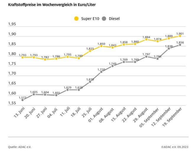 München (ots) Der Anstieg der Kraftstoffpreise geht auch in dieser Woche weiter. Vor allem Diesel verteuerte sich gegenüber der Vorwoche erneut in stärkerem Maße als Benzin. Dies zeigt die aktuelle ADAC Auswertung. Danach kostet ein Liter des Selbstzünderkraftstoffs im bundesweiten Mittel 1,856 Euro (plus 1,8 Cent). Der Preis für einen Liter Super E10 liegt aktuell im…