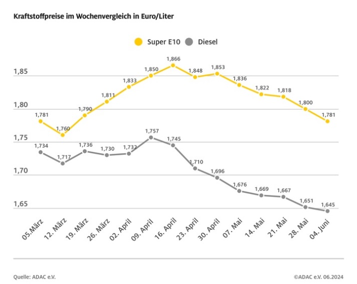 Die Kraftstoffpreise an den Tankstellen in Deutschland sinken weiter. Das zeigt sich besonders am Benzinpreis, wie die aktuelle wöchentliche ADAC Auswertung ergibt: Für einen Liter Super E10 müssen die Autofahrerinnen und Autofahrer derzeit im bundesweiten Mittel 1,781 Euro bezahlen und damit 1,9 Cent weniger als in der vergangenen Woche.